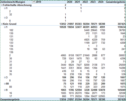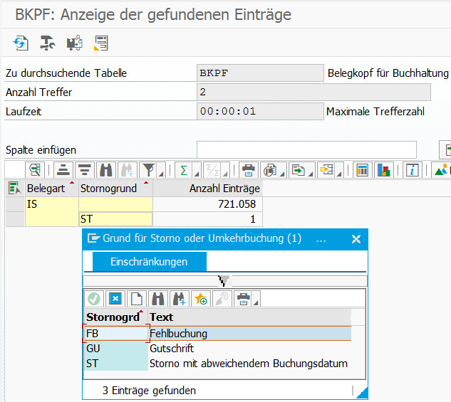 Empfohlen für Auswertung Pivot/Auswertungstabelle “Verteilung Stornogründe auf Belegarten” (BKPF, Stornogrund und Belegart gruppiert und sortiert)