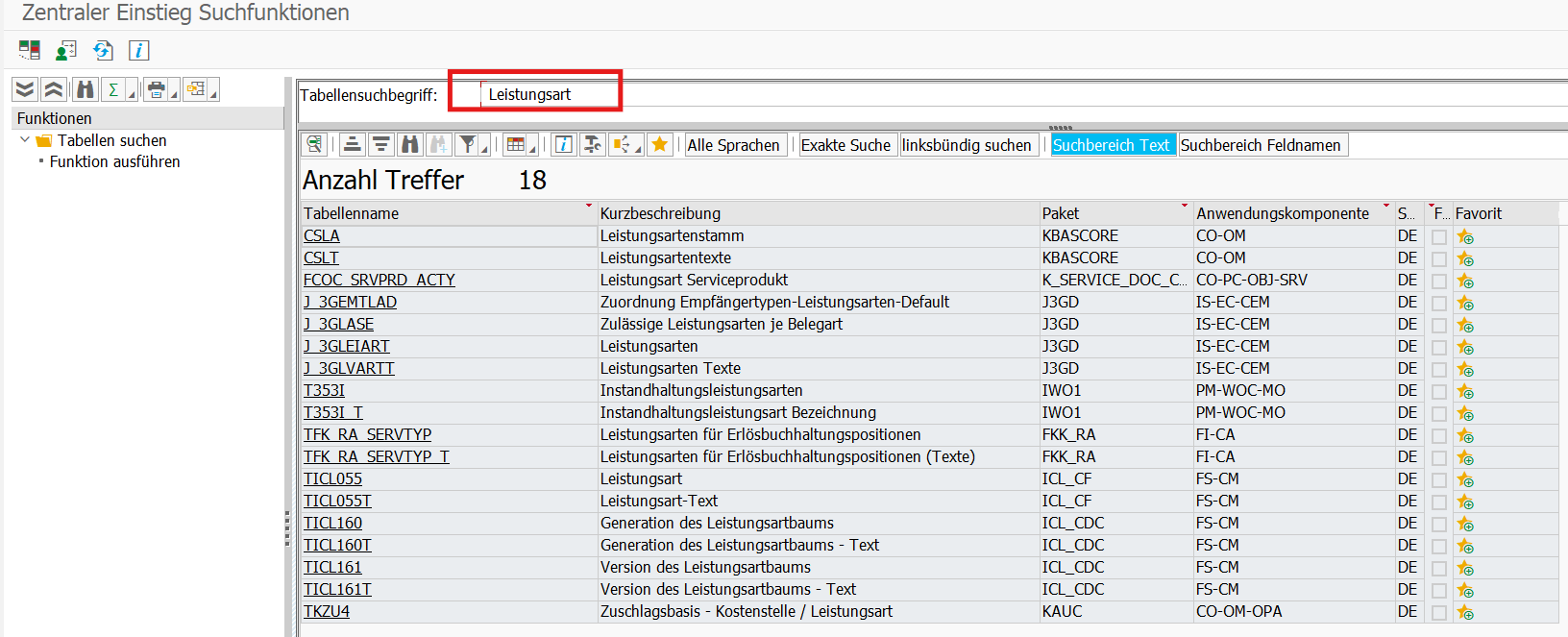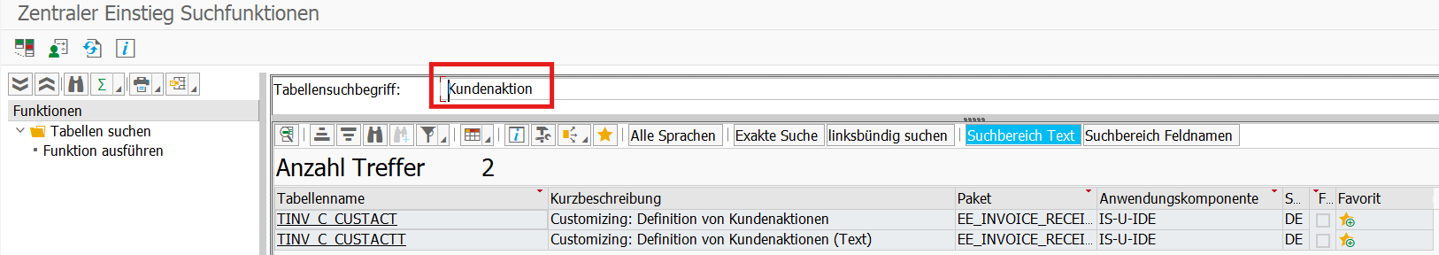 Über FELD Tabelle (rechten Kästchen daneben) z.B. “Kundenaktion” suchen -→ Alle Tabellen die mit Suchbegriff übereinstimmen werden angezeigt.: