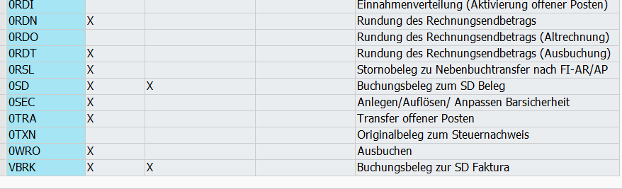 Referenzbelegart des Buchungsbeleges: Beschreibt die betriebswirtschaftliche Bedeutung der mit der Fakturierung verknüpften Buchungsbelege.
