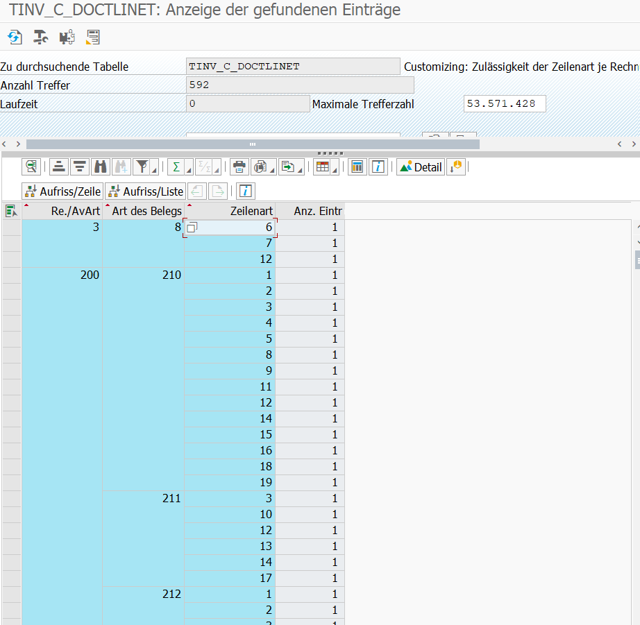 2. SE16H Tabelle TINV_C_DOCTLINET Customizing: Zulässigkeit der Zeilenart je Rechnungsart